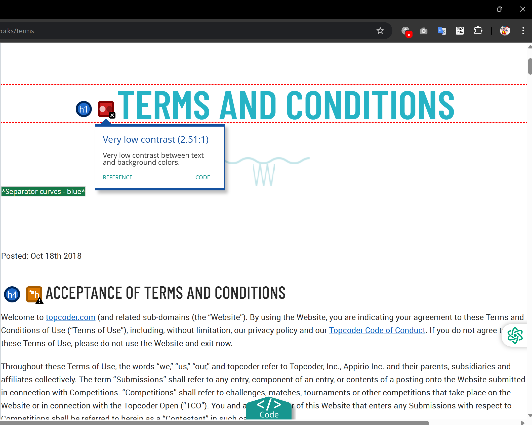 On the Terms page, the title text has a very low contrast ratio of 2.51:1, and failing accessibility standards.