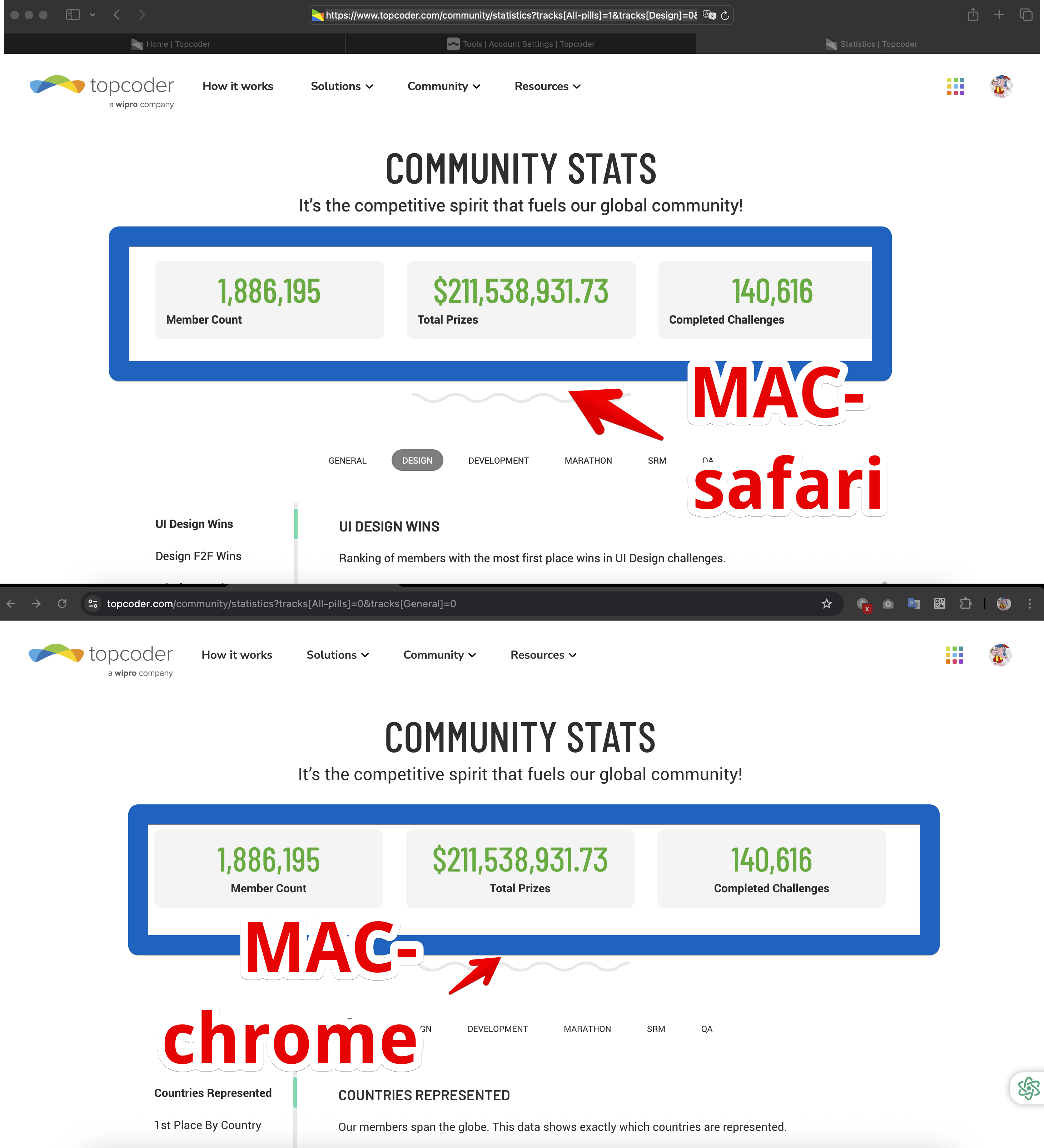On the 'Community Stats' page accessed via the 'Community' menu, the text under the tabs 'Member count', 'Total prizes', and 'Completed challenges' is left-aligned when viewed on Mac Safari browser. This is inconsistent with the display on Chrome, where the text is center-aligned as expected.